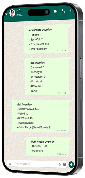 Get automated daily summaries of attendance, task status, visits, and expenses sent directly to your WhatsApp for instant visibility and convenience.